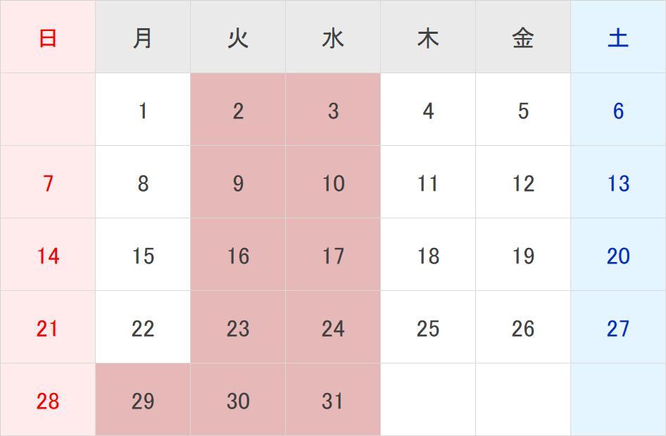 誠に勝手ながら年内は毎週火曜・第1・2・3水曜をお休みさせていただきます。お客様におかれましてはご不便、ご迷惑をお掛け致しますが、