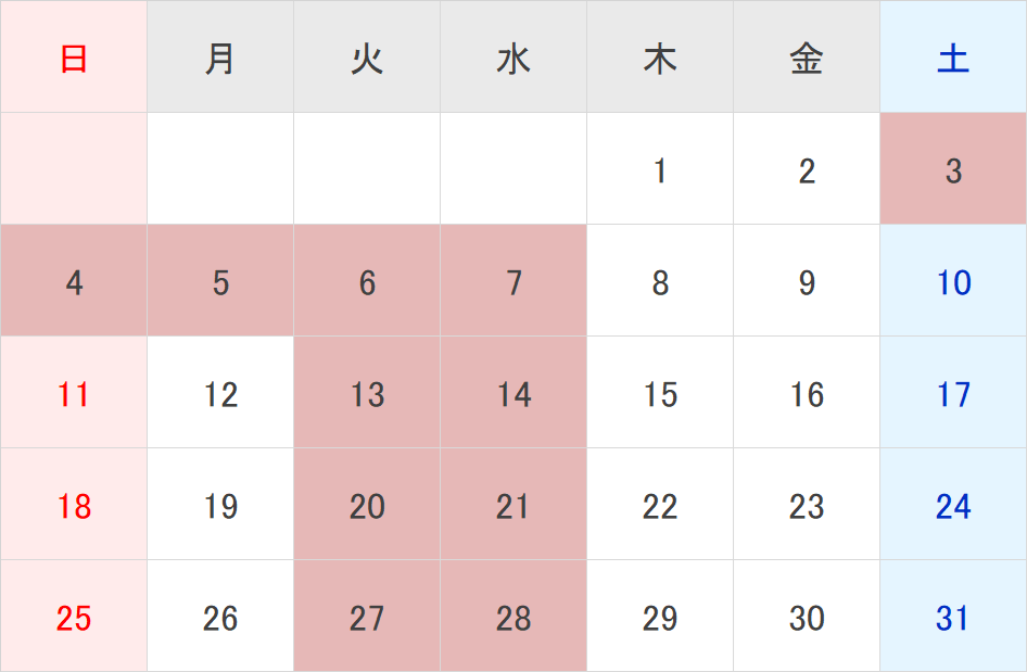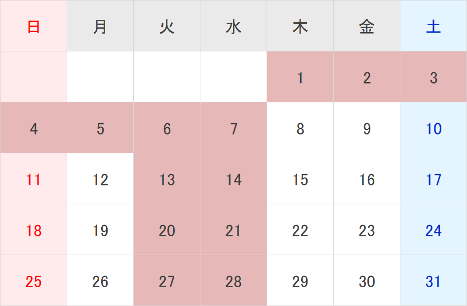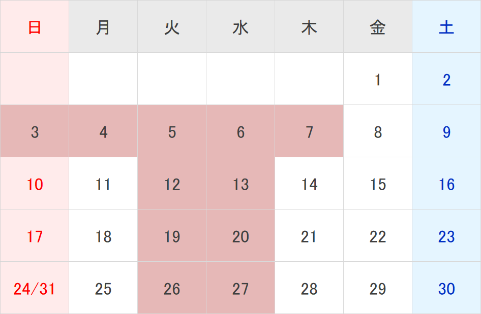 5/1 (月)~5(金)はお休みさせていただきます。申し訳ございませんが宜しくお願い致します。